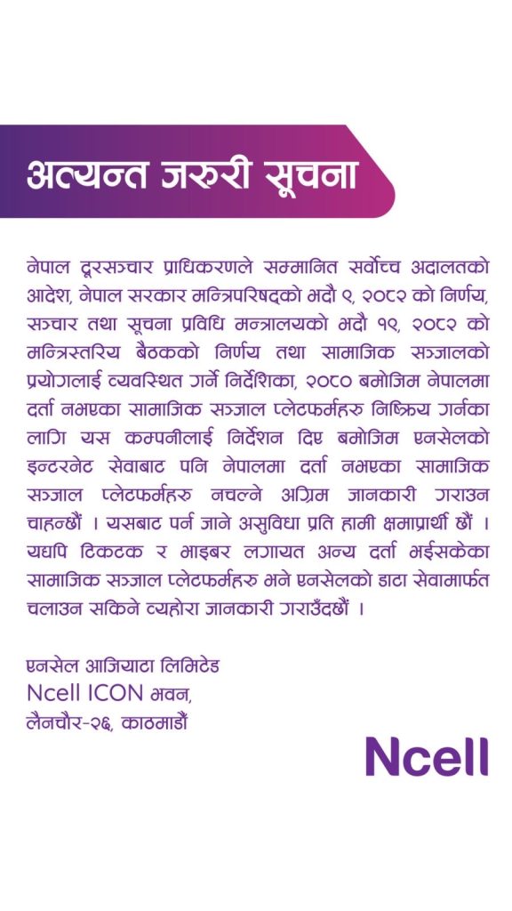 Ncell, the private largest telecom sector in Nepal have issued a notice to ban the unregistered 26 different social media citing the governing authority decision.